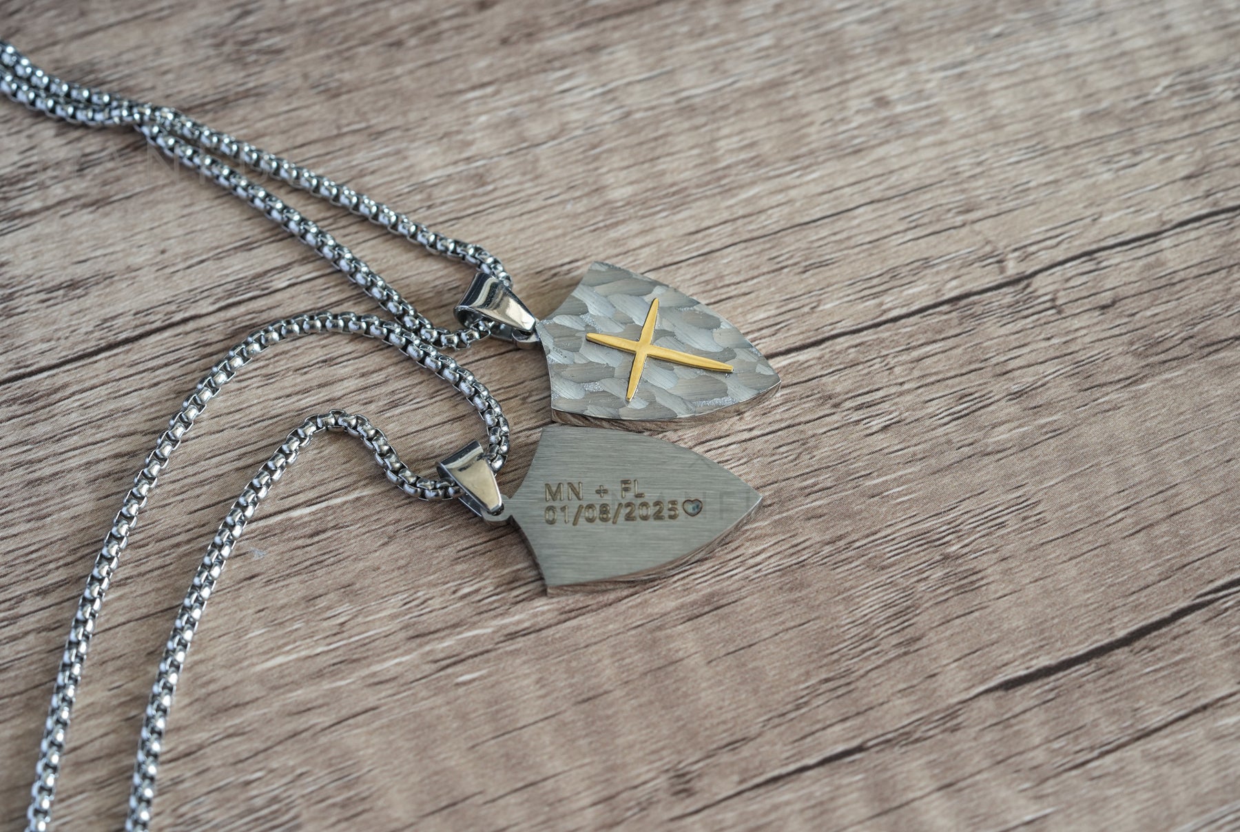 Stainless steel shield pendant with hammered texture and raised gold-tone cross on chain.
