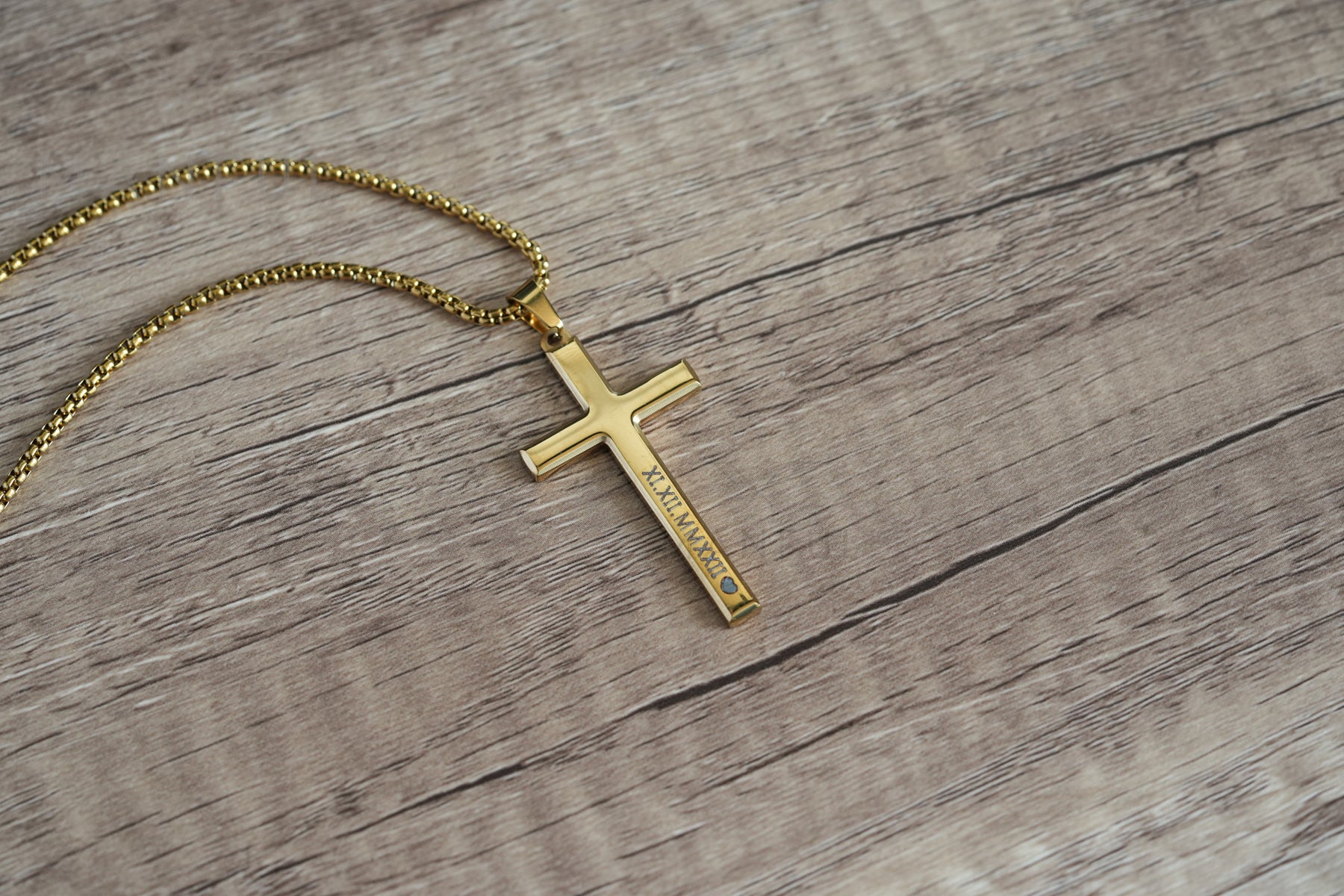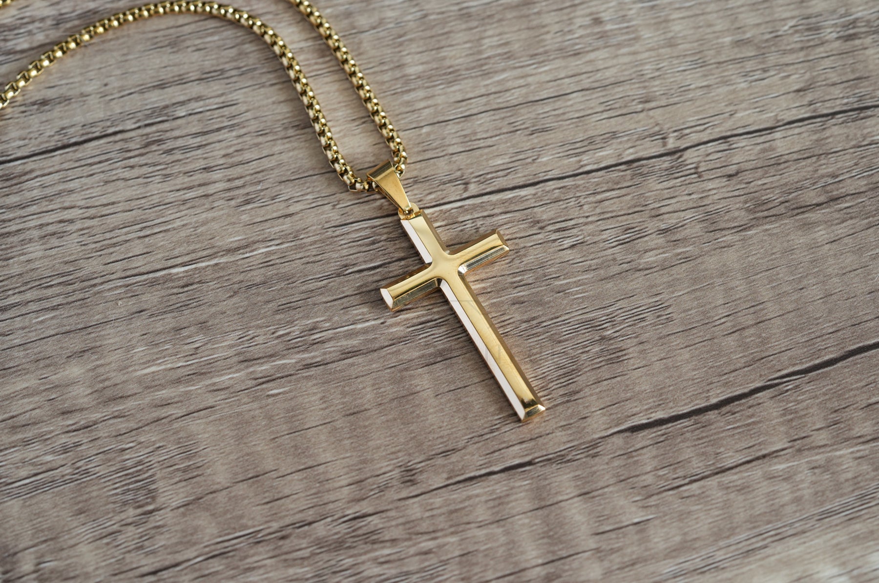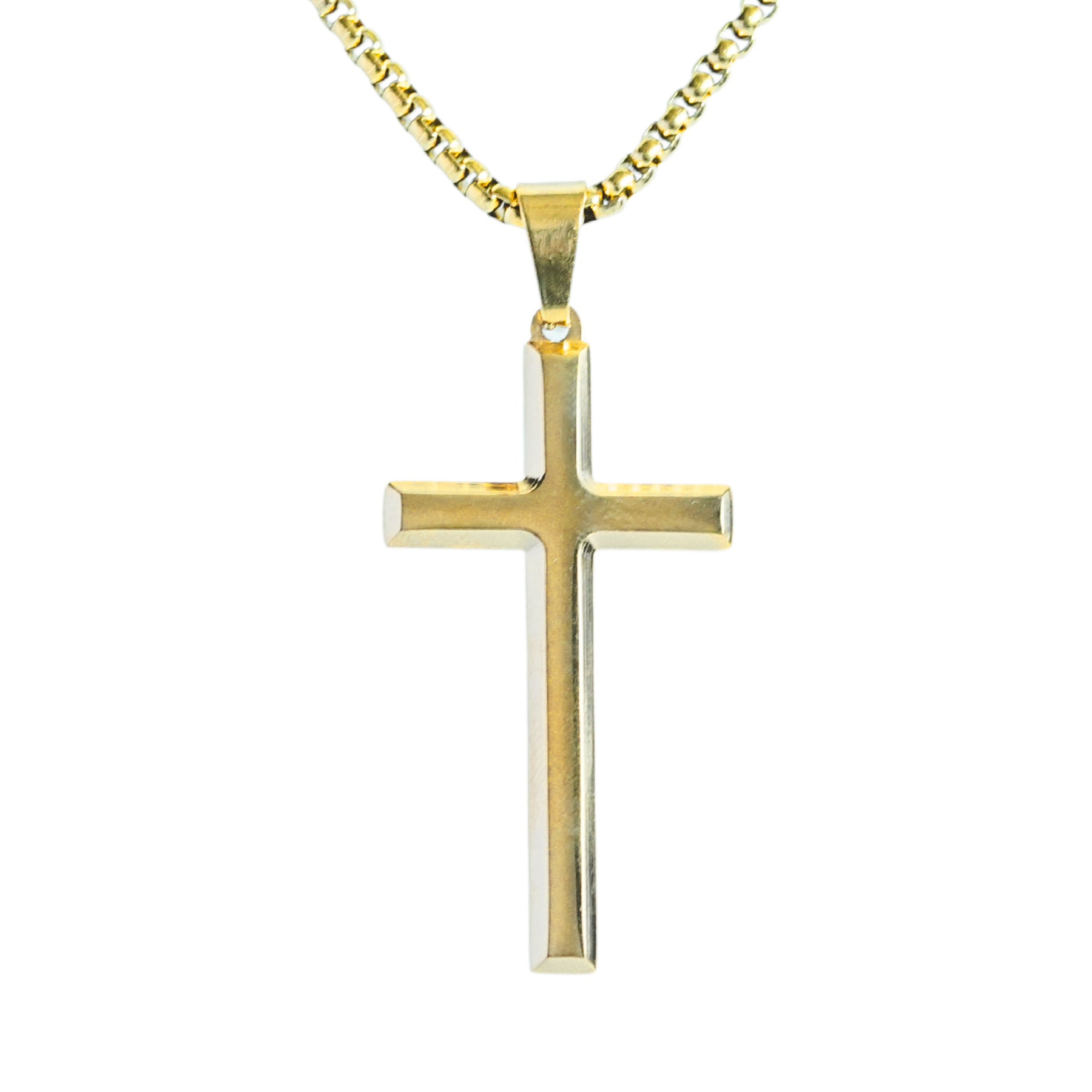 The Gold Cross Pendant is crafted from solid 316L stainless steel and finished with a bright 18k gold coating for a sleek, mirror-polished look. Its slim, geometric profile makes a sharp statement without looking bulky.