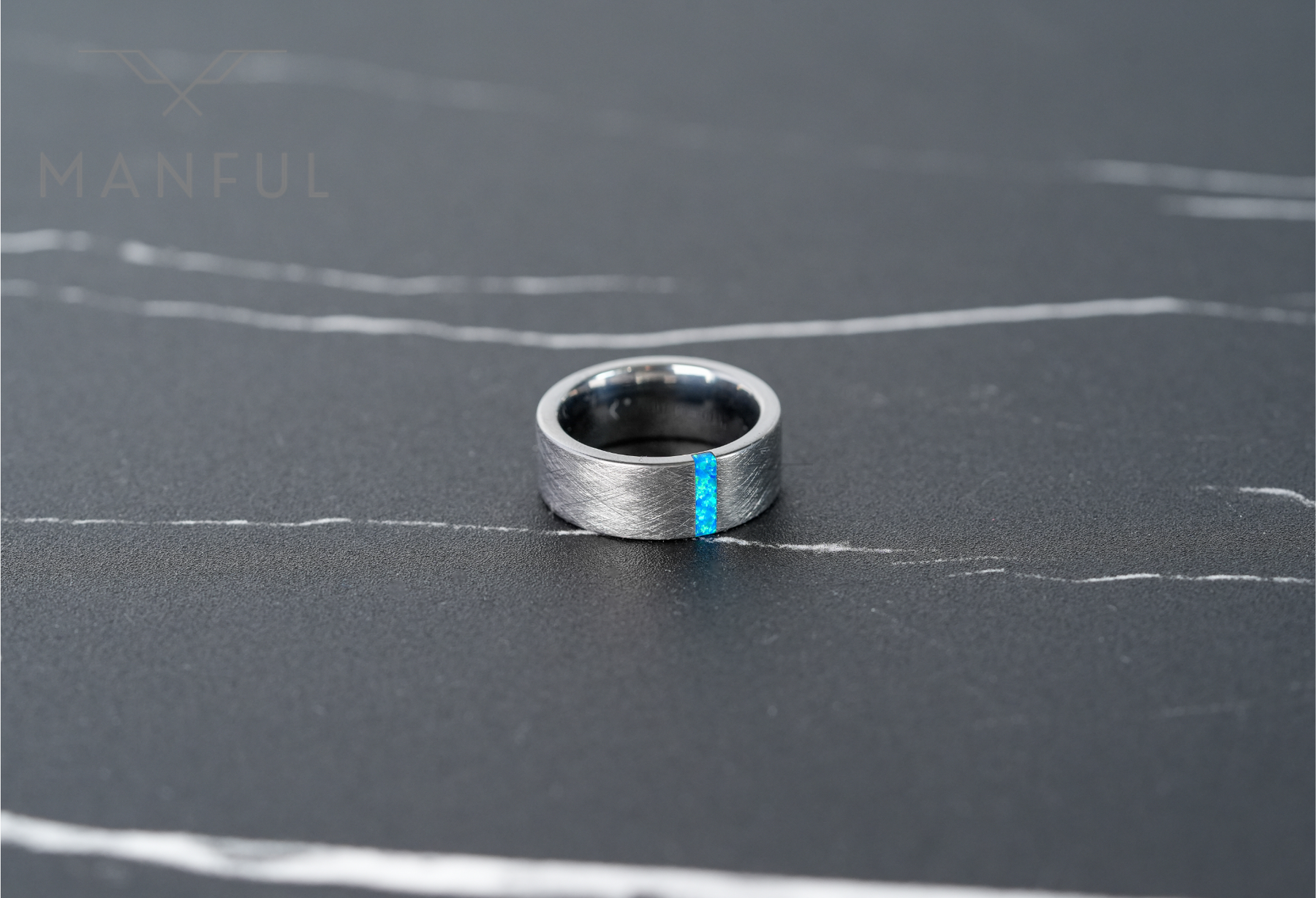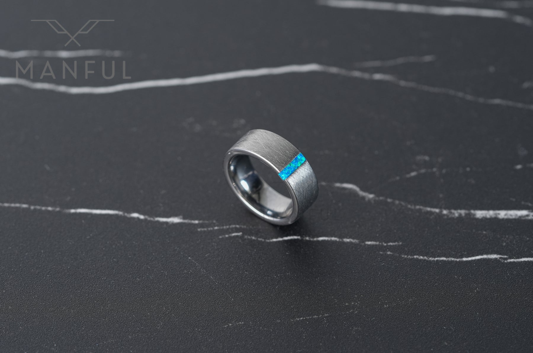 This tungsten ring showcases a custom-cut rectangular blue azure opal inlay set within a brushed tungsten band. Elegant and contemporary, it is a versatile choice suited for both everyday wear and as a distinctive alternative wedding band